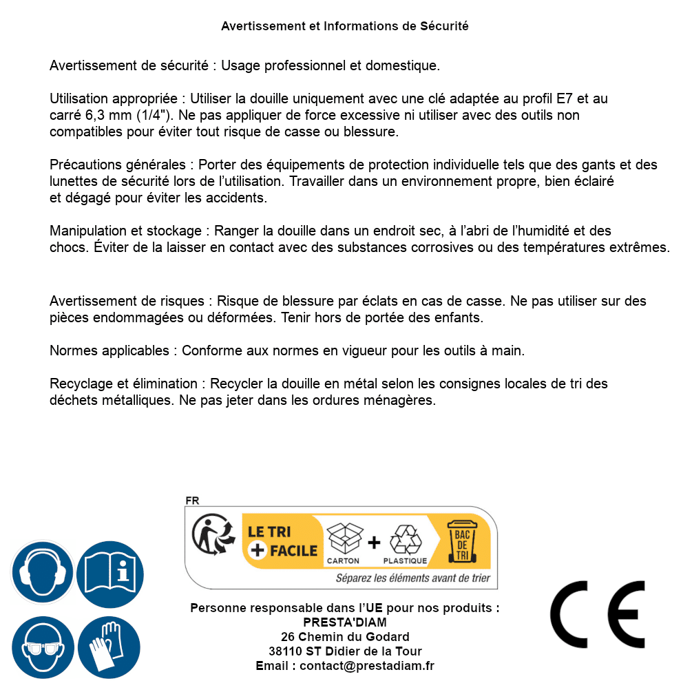 | AVERTISSEMENT et SECURITE | Identification de la personne responsable dans l’UE : Nom : PRESTA'DIAM. Adresse : 26 Chemin du Godard, 38110 ST Didier de la Tour (France). Email : contact@prestadiam.fr. |