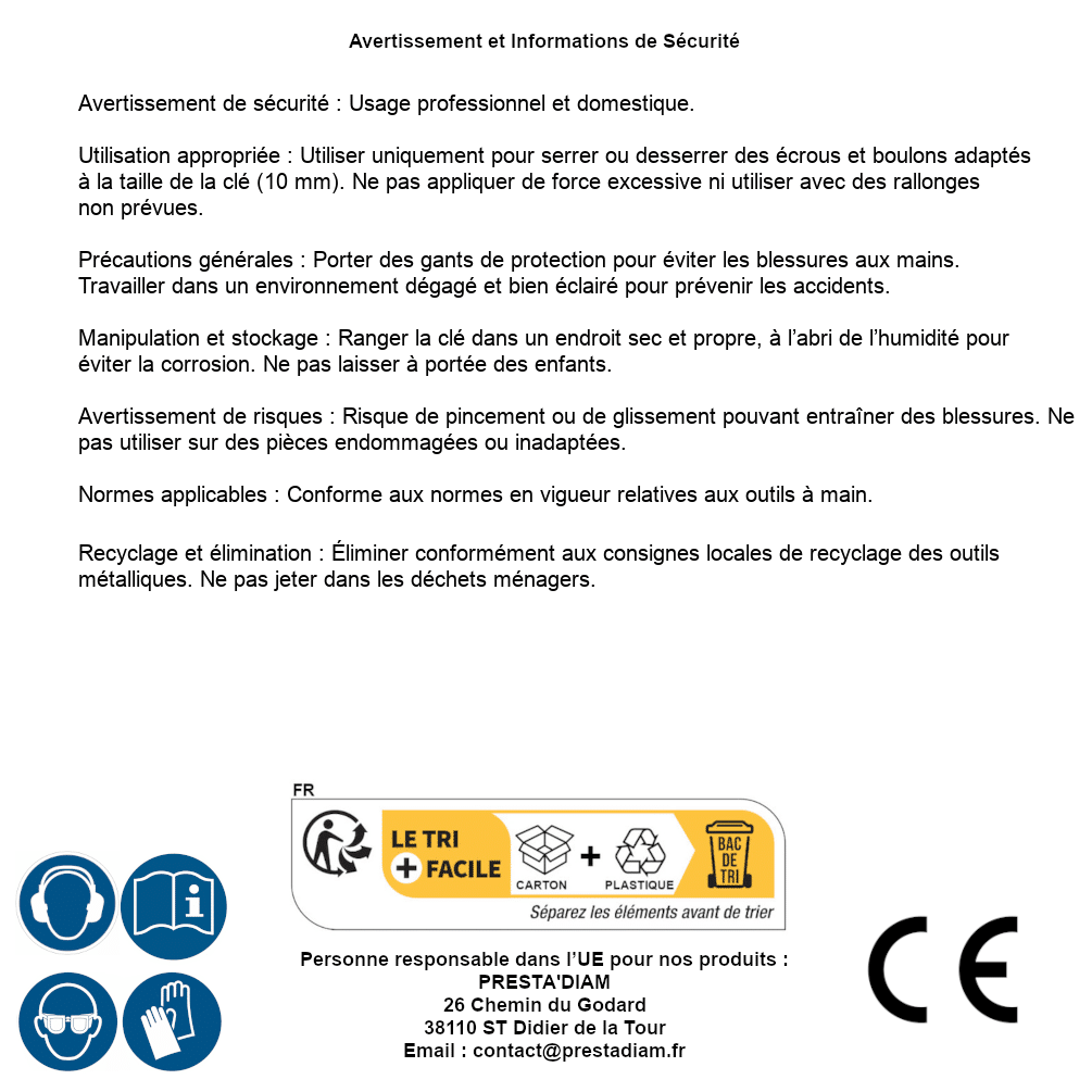 | AVERTISSEMENT et SECURITE | Identification de la personne responsable dans l’UE : Nom : PRESTA'DIAM. Adresse : 26 Chemin du Godard, 38110 ST Didier de la Tour (France). Email : contact@prestadiam.fr. |