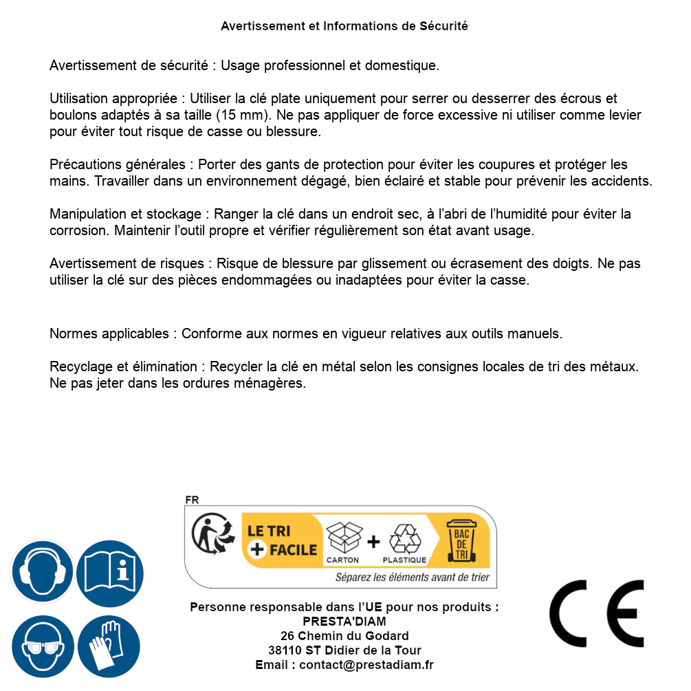 | AVERTISSEMENT et SECURITE | Identification de la personne responsable dans l’UE : Nom : PRESTA'DIAM. Adresse : 26 Chemin du Godard, 38110 ST Didier de la Tour (France). Email : contact@prestadiam.fr. |