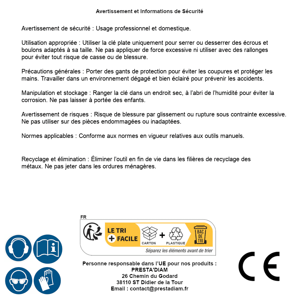 | AVERTISSEMENT et SECURITE | Identification de la personne responsable dans l’UE : Nom : PRESTA'DIAM. Adresse : 26 Chemin du Godard, 38110 ST Didier de la Tour (France). Email : contact@prestadiam.fr. |