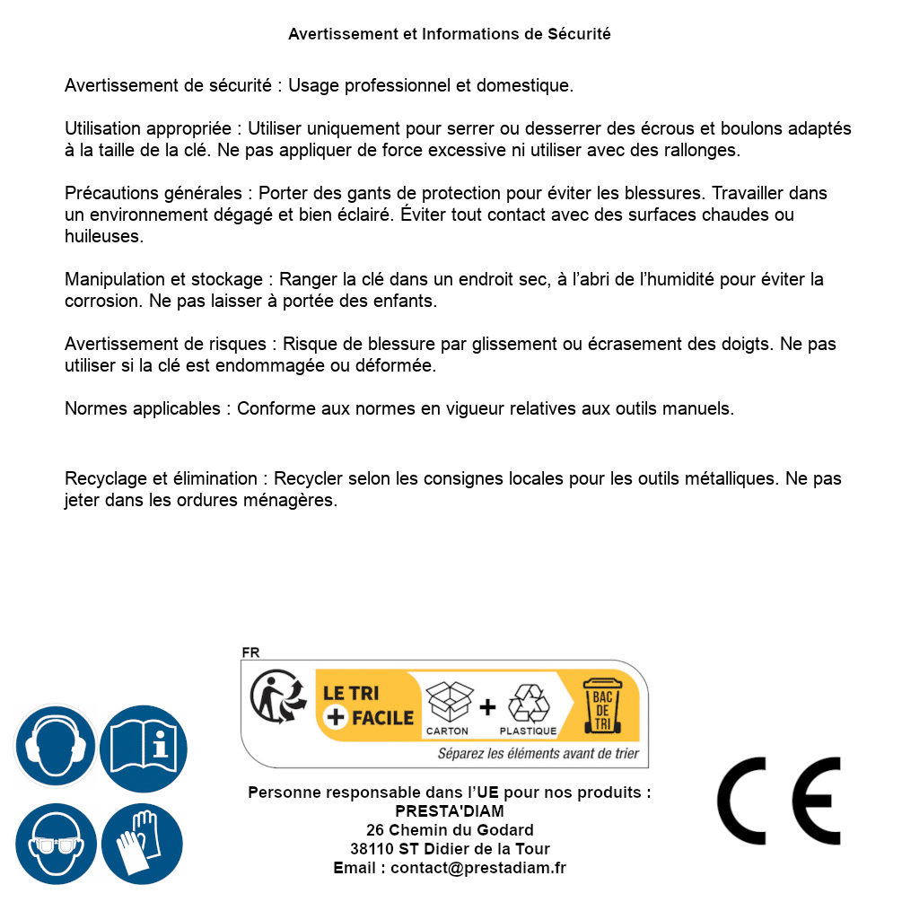 | AVERTISSEMENT et SECURITE | Identification de la personne responsable dans l’UE : Nom : PRESTA'DIAM. Adresse : 26 Chemin du Godard, 38110 ST Didier de la Tour (France). Email : contact@prestadiam.fr. |