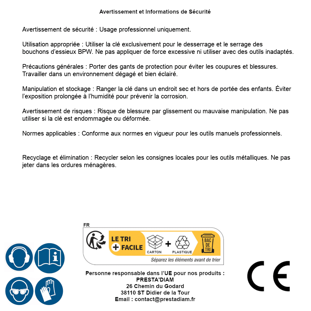 | AVERTISSEMENT et SECURITE | Identification de la personne responsable dans l’UE : Nom : PRESTA'DIAM. Adresse : 26 Chemin du Godard, 38110 ST Didier de la Tour (France). Email : contact@prestadiam.fr. |