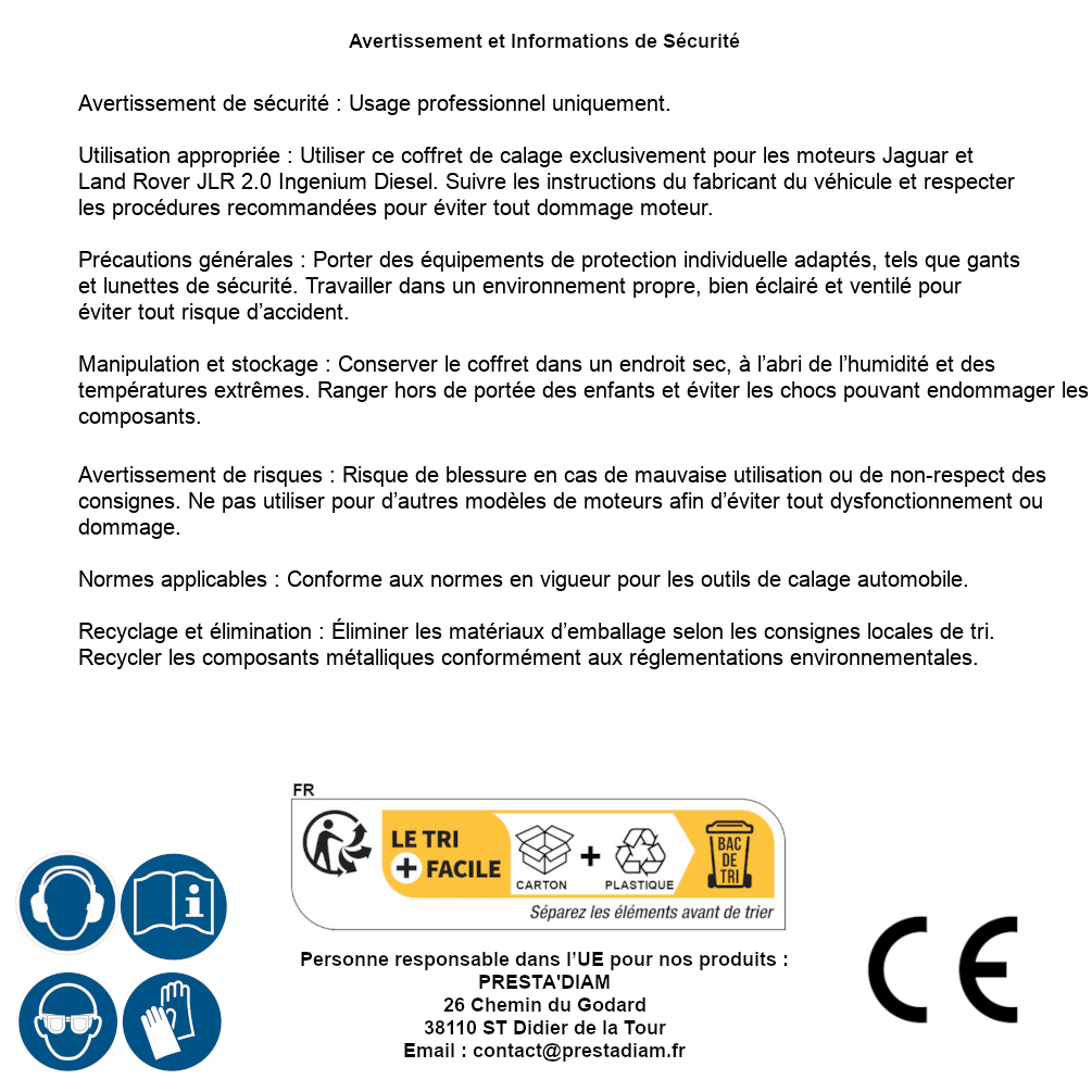 | AVERTISSEMENT et SECURITE | Identification de la personne responsable dans l’UE : Nom : PRESTA'DIAM. Adresse : 26 Chemin du Godard, 38110 ST Didier de la Tour (France). Email : contact@prestadiam.fr. |