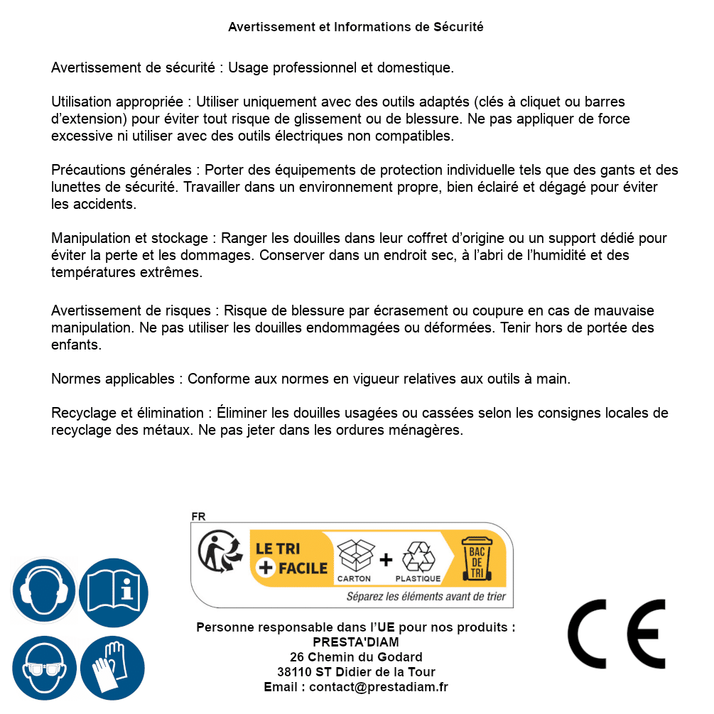 | AVERTISSEMENT et SECURITE | Identification de la personne responsable dans l’UE : Nom : PRESTA'DIAM. Adresse : 26 Chemin du Godard, 38110 ST Didier de la Tour (France). Email : contact@prestadiam.fr. |