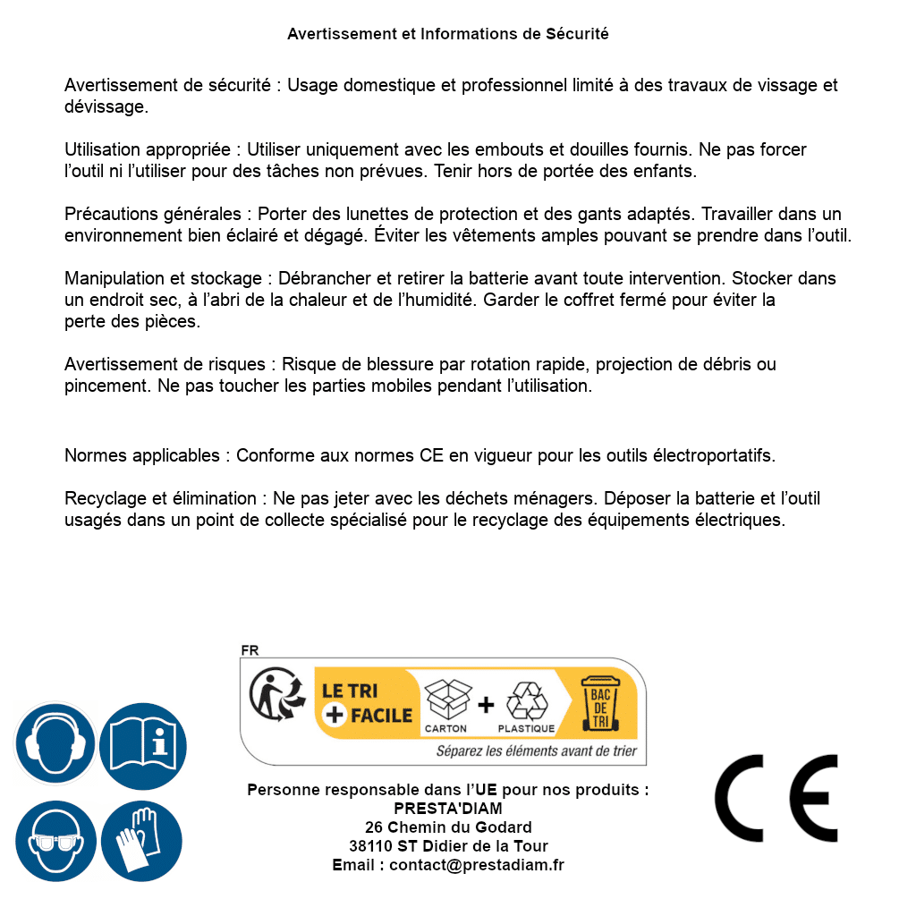 | AVERTISSEMENT et SECURITE | Identification de la personne responsable dans l’UE : Nom : PRESTA'DIAM. Adresse : 26 Chemin du Godard, 38110 ST Didier de la Tour (France). Email : contact@prestadiam.fr. |