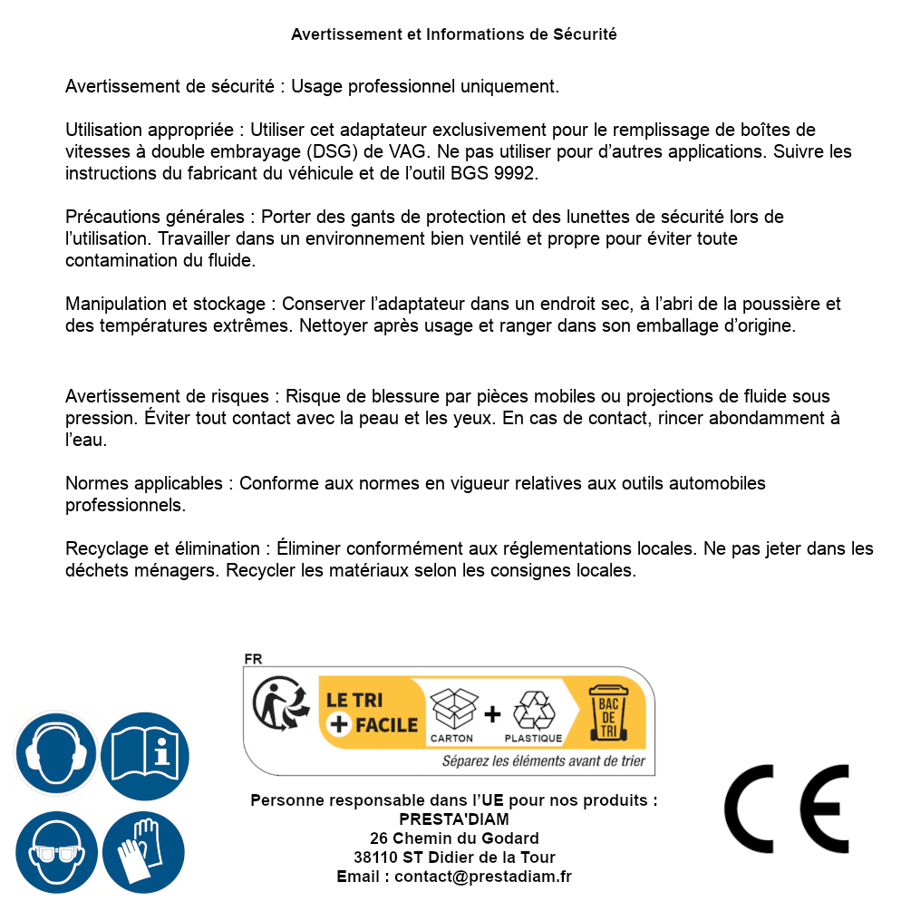 | AVERTISSEMENT et SECURITE | Identification de la personne responsable dans l’UE : Nom : PRESTA'DIAM. Adresse : 26 Chemin du Godard, 38110 ST Didier de la Tour (France). Email : contact@prestadiam.fr. |