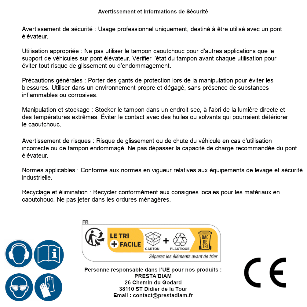 | AVERTISSEMENT et SECURITE | Identification de la personne responsable dans l’UE : Nom : PRESTA'DIAM. Adresse : 26 Chemin du Godard, 38110 ST Didier de la Tour (France). Email : contact@prestadiam.fr. |