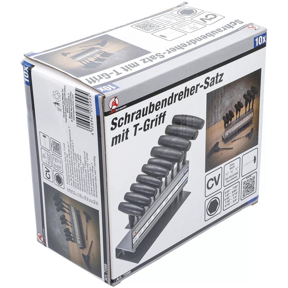 Ce jeu de 10 tournevis à poignée en T de la marque BGS est conçu pour les travaux de précision nécessitant des embouts six pans intérieurs allant de 3/32" à 3/8". Idéal pour les professionnels et les amateurs, il offre une prise en main confortable et un contrôle optimal grâce à sa poignée ergonomique en forme de T.Caractéristiques principales