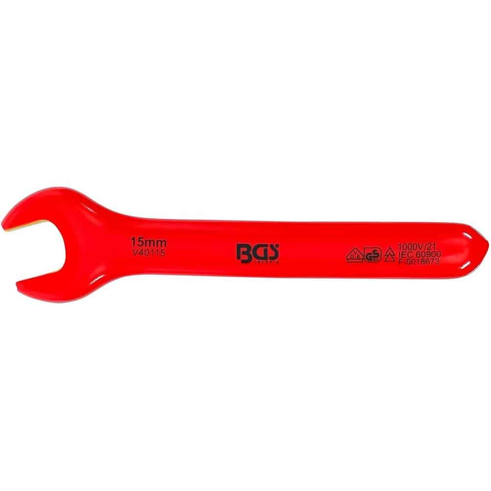 La Clé à Fourche VDE 15 mm de la marque BGS est un outil professionnel conçu pour les travaux électriques nécessitant une sécurité optimale. Certifiée VDE, elle garantit une isolation efficace jusqu'à 1000 volts, protégeant l'utilisateur contre les risques d'électrocution. Sa taille de 15 mm permet un usage précis sur les écrous et boulons standards.Caractéristiques principales