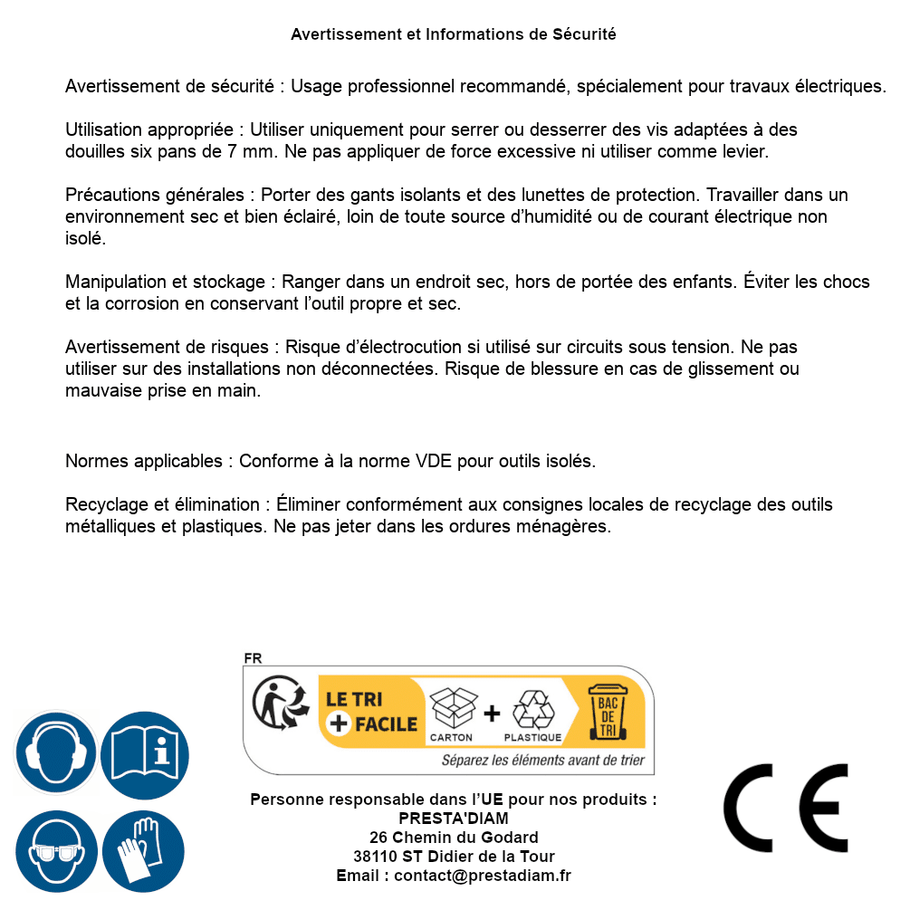 | AVERTISSEMENT et SECURITE | Identification de la personne responsable dans l’UE : Nom : PRESTA'DIAM. Adresse : 26 Chemin du Godard, 38110 ST Didier de la Tour (France). Email : contact@prestadiam.fr. |