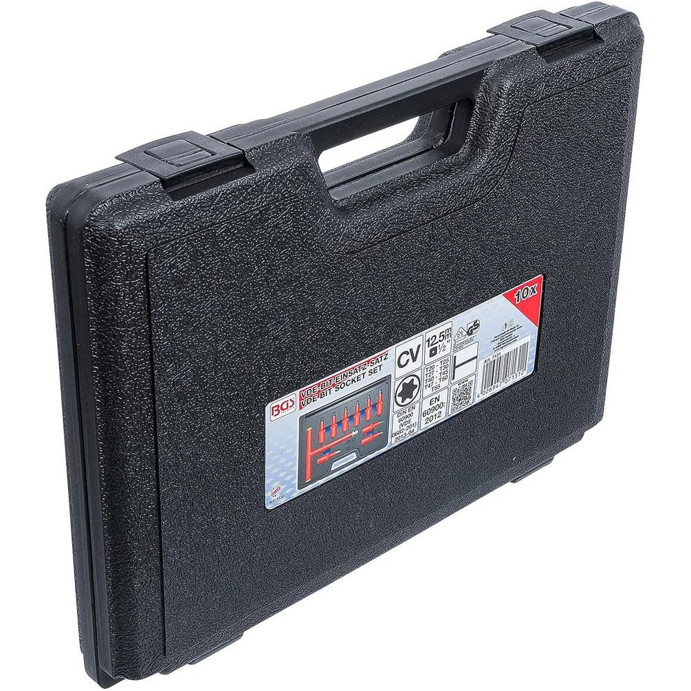 Le jeu de douilles à embouts VDE BGS comprend 10 pièces conçues pour une utilisation sécurisée sur des installations électriques sous tension jusqu'à 1000 V. Chaque douille est équipée d'une empreinte carré femelle de 12,5 mm (1/2") et d'un profil Torx allant de T20 à T55, garantissant une compatibilité optimale avec les vis Torx courantes. Ce kit est idéal pour les professionnels et les bricoleurs exigeants qui recherchent sécurité et performance.Caractéristiques principales