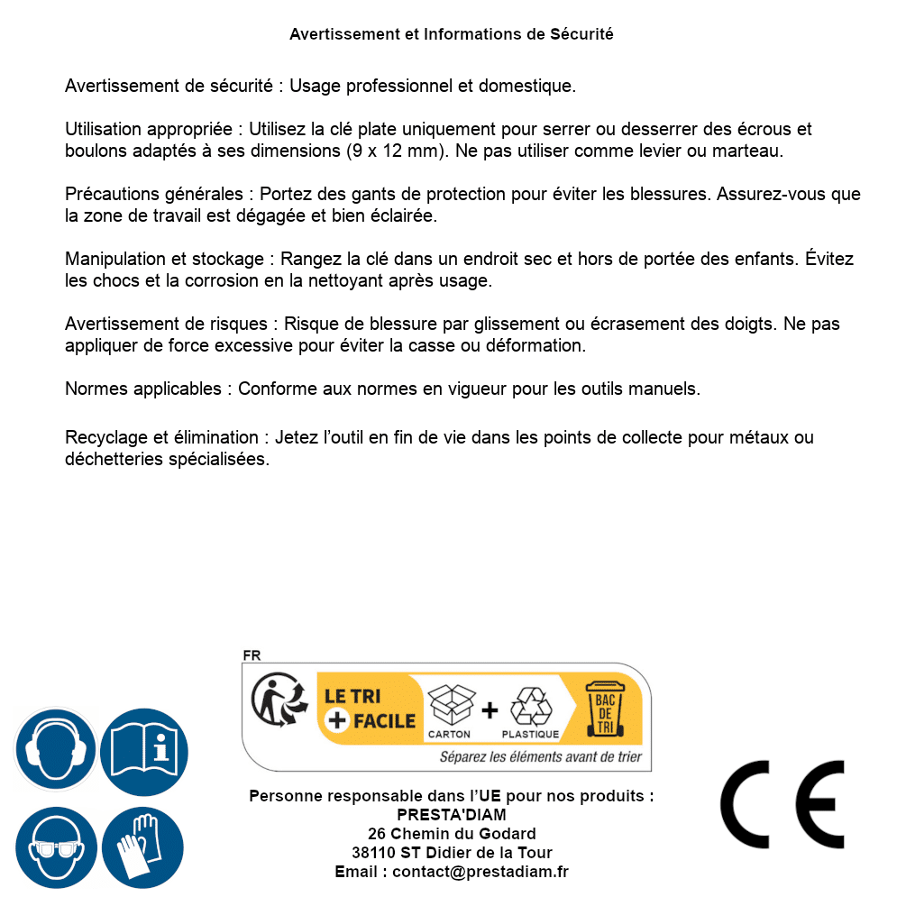 | AVERTISSEMENT et SECURITE | Identification de la personne responsable dans l’UE : Nom : PRESTA'DIAM. Adresse : 26 Chemin du Godard, 38110 ST Didier de la Tour (France). Email : contact@prestadiam.fr. |