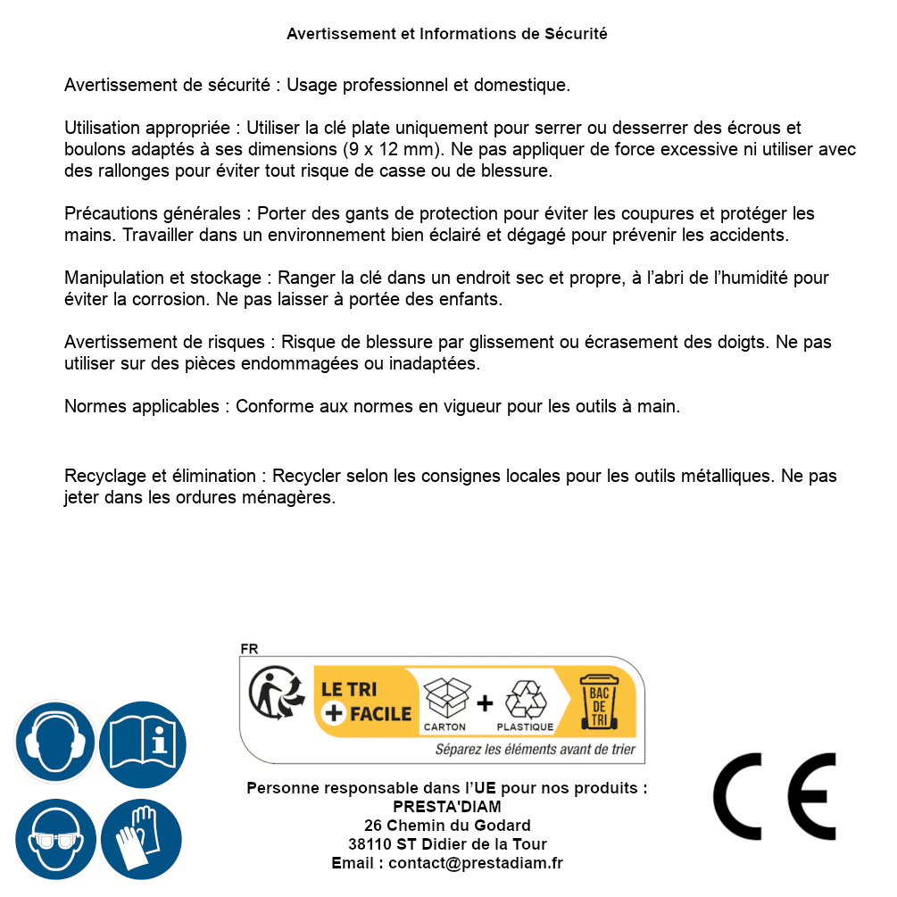 | AVERTISSEMENT et SECURITE | Identification de la personne responsable dans l’UE : Nom : PRESTA'DIAM. Adresse : 26 Chemin du Godard, 38110 ST Didier de la Tour (France). Email : contact@prestadiam.fr. |