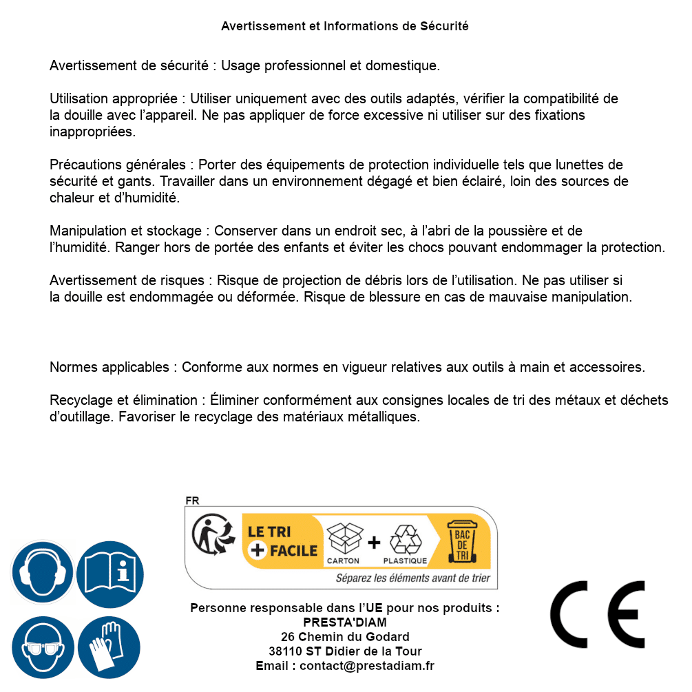 | AVERTISSEMENT et SECURITE | Identification de la personne responsable dans l’UE : Nom : PRESTA'DIAM. Adresse : 26 Chemin du Godard, 38110 ST Didier de la Tour (France). Email : contact@prestadiam.fr. |