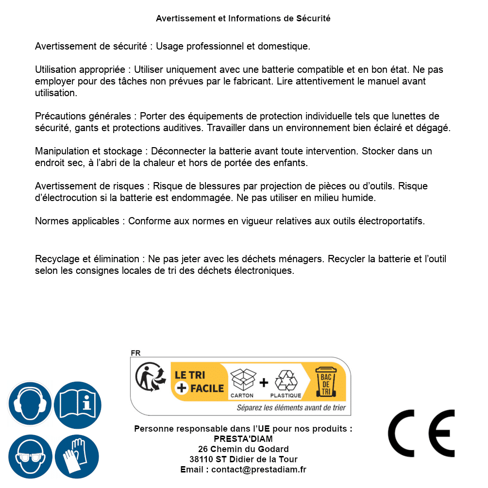 | AVERTISSEMENT et SECURITE | Identification de la personne responsable dans l’UE : Nom : PRESTA'DIAM. Adresse : 26 Chemin du Godard, 38110 ST Didier de la Tour (France). Email : contact@prestadiam.fr. |