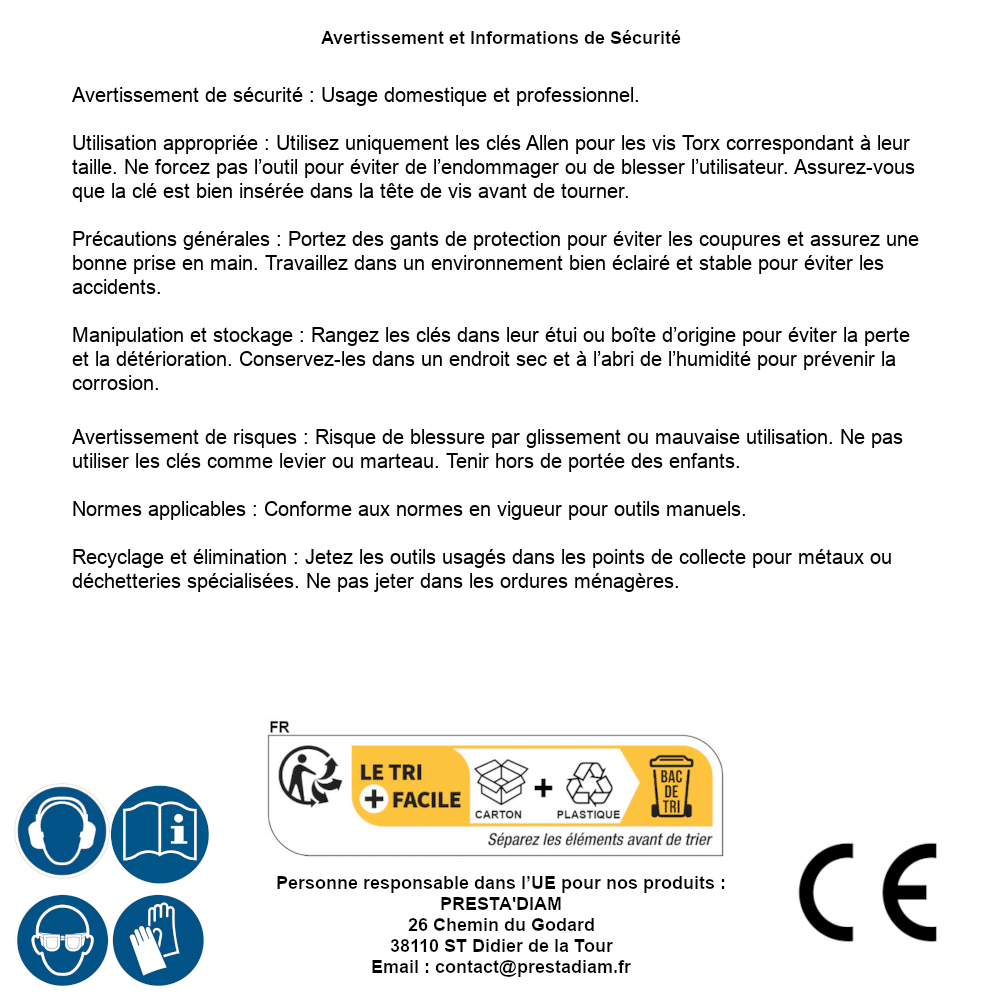| AVERTISSEMENT et SECURITE | Identification de la personne responsable dans l’UE : Nom : PRESTA'DIAM. Adresse : 26 Chemin du Godard, 38110 ST Didier de la Tour (France). Email : contact@prestadiam.fr. |