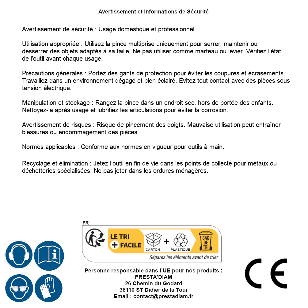 | AVERTISSEMENT et SECURITE | Identification de la personne responsable dans l’UE : Nom : PRESTA'DIAM. Adresse : 26 Chemin du Godard, 38110 ST Didier de la Tour (France). Email : contact@prestadiam.fr. |