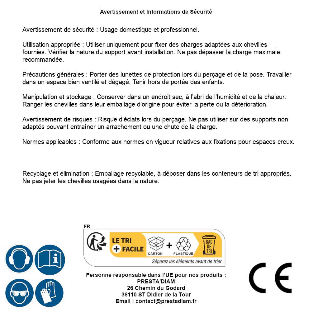 | AVERTISSEMENT et SECURITE | Identification de la personne responsable dans l’UE : Nom : PRESTA'DIAM. Adresse : 26 Chemin du Godard, 38110 ST Didier de la Tour (France). Email : contact@prestadiam.fr. |