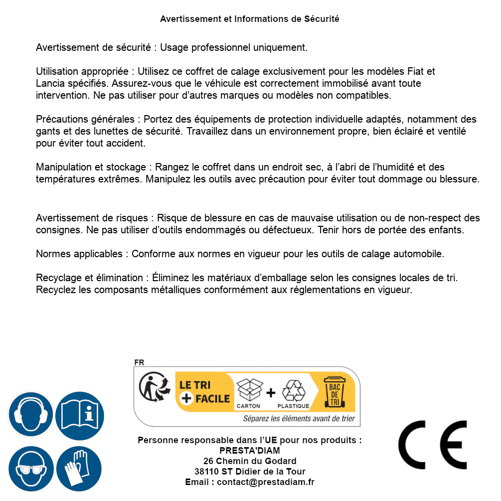 - Contenu : Ensemble complet d'outils de calage adaptés aux moteurs Fiat et Lancia