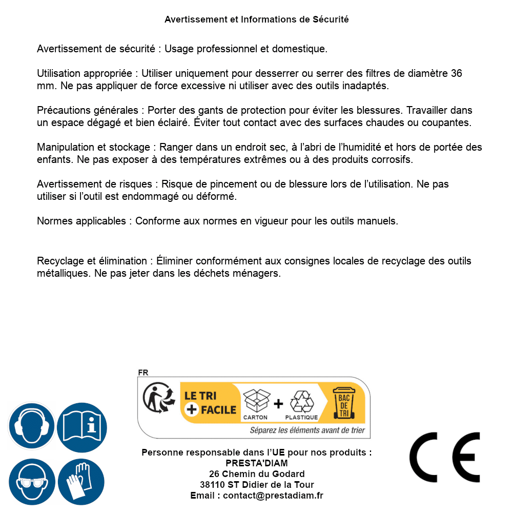 | AVERTISSEMENT et SECURITE | Identification de la personne responsable dans l’UE : Nom : PRESTA'DIAM. Adresse : 26 Chemin du Godard, 38110 ST Didier de la Tour (France). Email : contact@prestadiam.fr. |