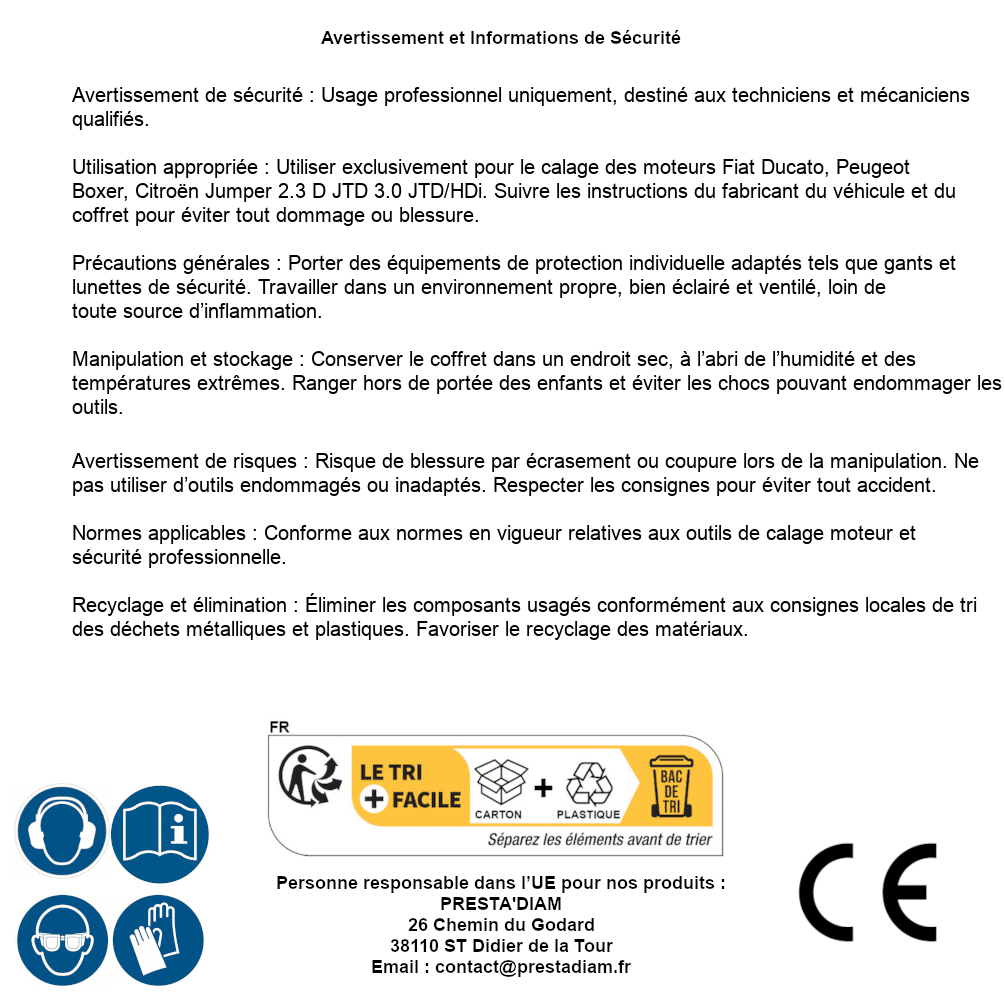 | AVERTISSEMENT et SECURITE | Identification de la personne responsable dans l’UE : Nom : PRESTA'DIAM. Adresse : 26 Chemin du Godard, 38110 ST Didier de la Tour (France). Email : contact@prestadiam.fr. |