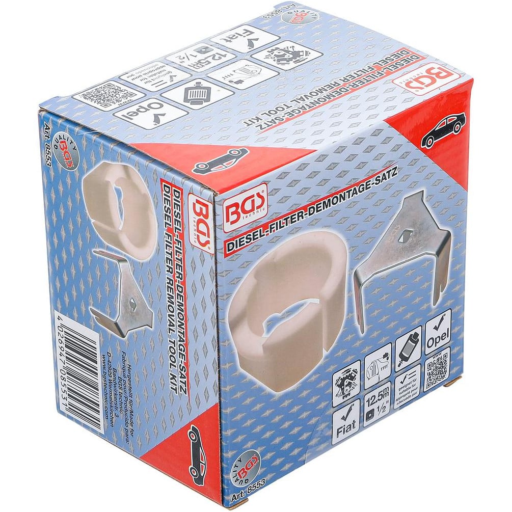 La clé de démontage de filtre diesel BGS est un outil spécialisé conçu pour faciliter le retrait des filtres à carburant sur les véhicules Opel et Fiat. Fabriquée avec des matériaux robustes, cette clé assure une prise sûre et un démontage efficace, évitant d'endommager le filtre ou les composants environnants.Caractéristiques principales