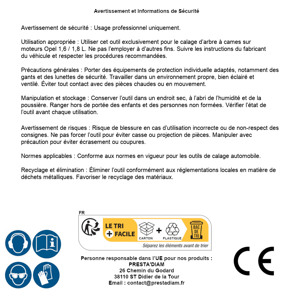 | AVERTISSEMENT et SECURITE | Identification de la personne responsable dans l’UE : Nom : PRESTA'DIAM. Adresse : 26 Chemin du Godard, 38110 ST Didier de la Tour (France). Email : contact@prestadiam.fr. |