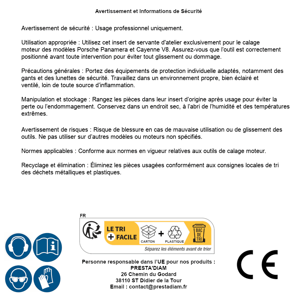 | AVERTISSEMENT et SECURITE | Identification de la personne responsable dans l’UE : Nom : PRESTA'DIAM. Adresse : 26 Chemin du Godard, 38110 ST Didier de la Tour (France). Email : contact@prestadiam.fr. |