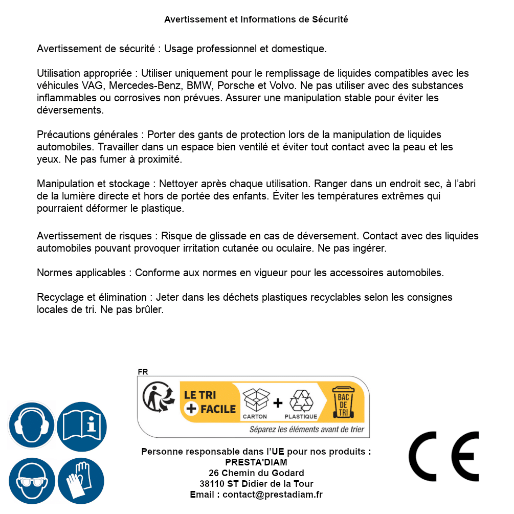 | AVERTISSEMENT et SECURITE | Identification de la personne responsable dans l’UE : Nom : PRESTA'DIAM. Adresse : 26 Chemin du Godard, 38110 ST Didier de la Tour (France). Email : contact@prestadiam.fr. |