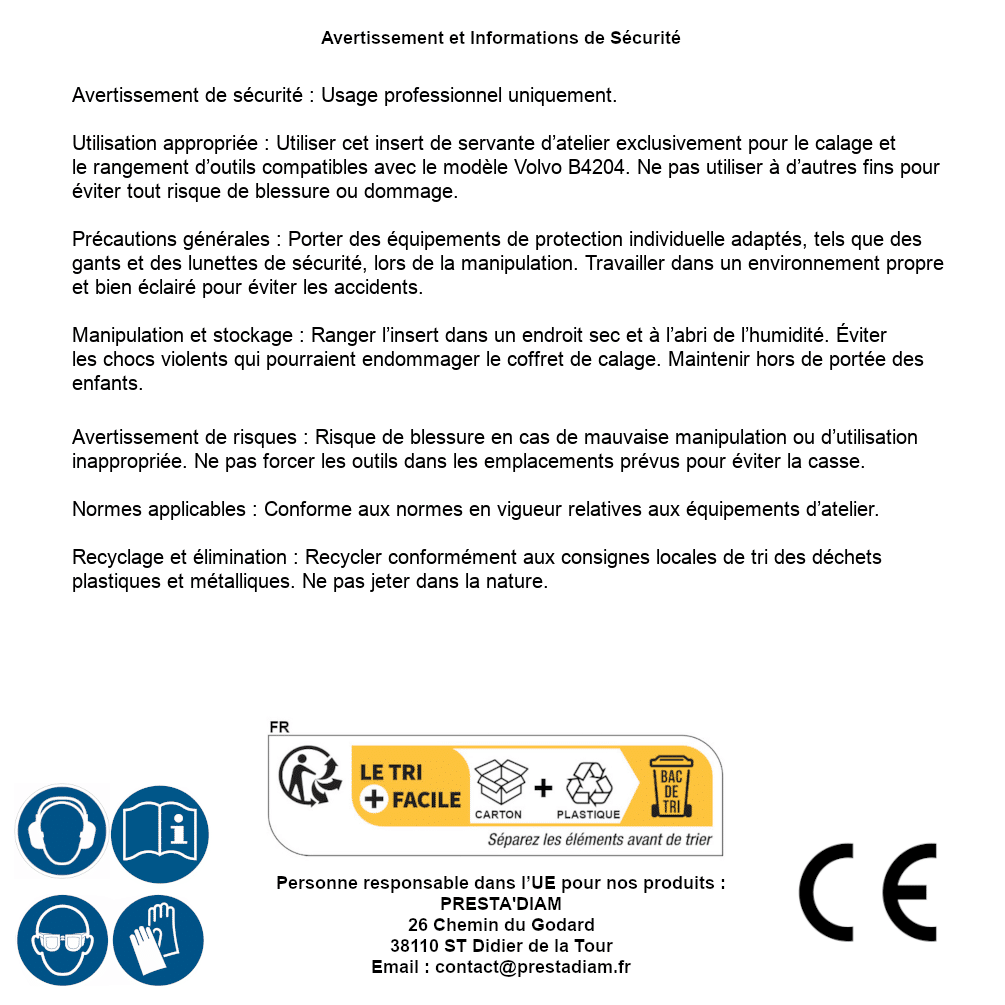 | AVERTISSEMENT et SECURITE | Identification de la personne responsable dans l’UE : Nom : PRESTA'DIAM. Adresse : 26 Chemin du Godard, 38110 ST Didier de la Tour (France). Email : contact@prestadiam.fr. |