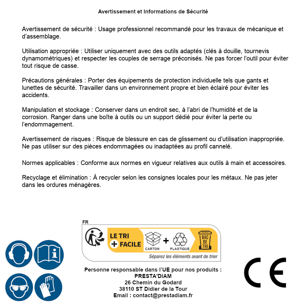 | AVERTISSEMENT et SECURITE | Identification de la personne responsable dans l’UE : Nom : PRESTA'DIAM. Adresse : 26 Chemin du Godard, 38110 ST Didier de la Tour (France). Email : contact@prestadiam.fr. |