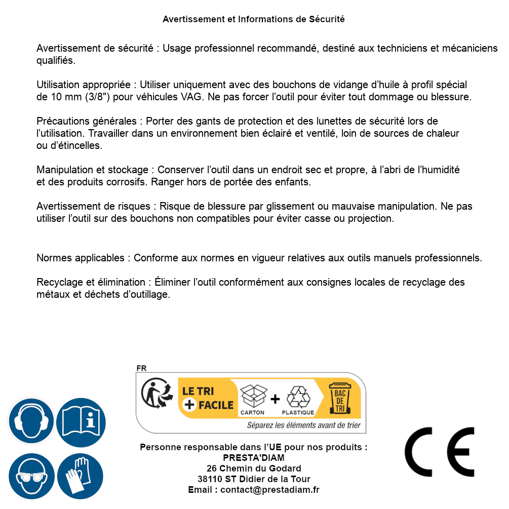 | AVERTISSEMENT et SECURITE | Identification de la personne responsable dans l’UE : Nom : PRESTA'DIAM. Adresse : 26 Chemin du Godard, 38110 ST Didier de la Tour (France). Email : contact@prestadiam.fr. |