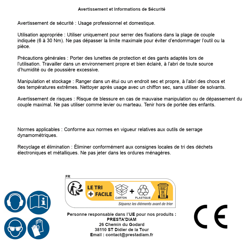 | AVERTISSEMENT et SECURITE | Identification de la personne responsable dans l’UE : Nom : PRESTA'DIAM. Adresse : 26 Chemin du Godard, 38110 ST Didier de la Tour (France). Email : contact@prestadiam.fr. |