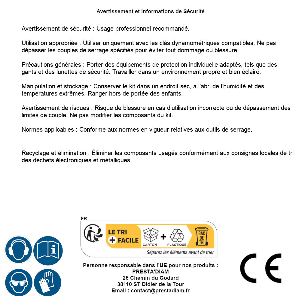 | AVERTISSEMENT et SECURITE | Identification de la personne responsable dans l’UE : Nom : PRESTA'DIAM. Adresse : 26 Chemin du Godard, 38110 ST Didier de la Tour (France). Email : contact@prestadiam.fr. |
