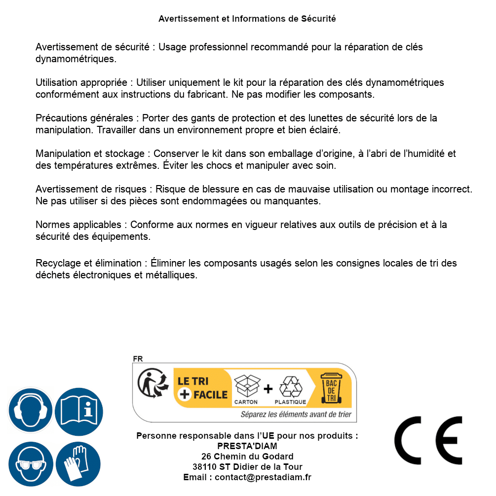 | AVERTISSEMENT et SECURITE | Identification de la personne responsable dans l’UE : Nom : PRESTA'DIAM. Adresse : 26 Chemin du Godard, 38110 ST Didier de la Tour (France). Email : contact@prestadiam.fr. |