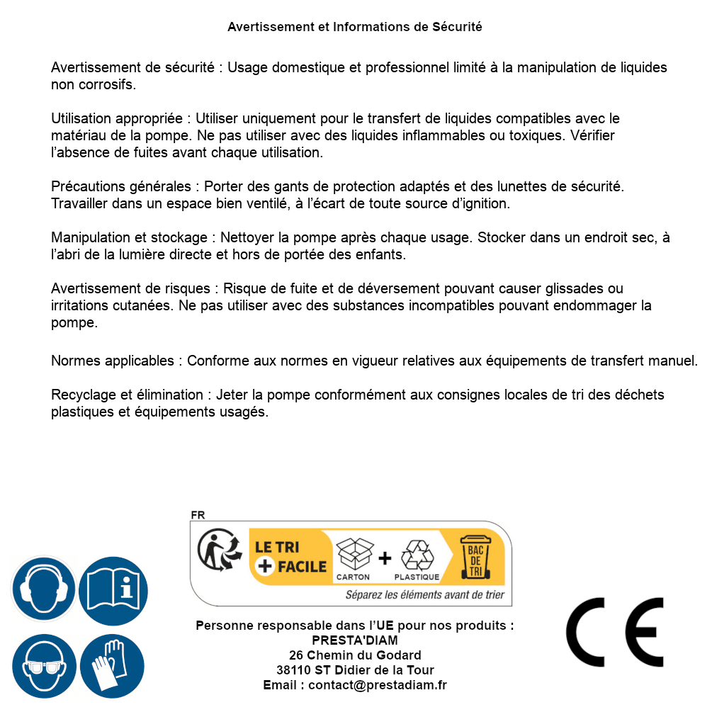 | AVERTISSEMENT et SECURITE | Identification de la personne responsable dans l’UE : Nom : PRESTA'DIAM. Adresse : 26 Chemin du Godard, 38110 ST Didier de la Tour (France). Email : contact@prestadiam.fr. |