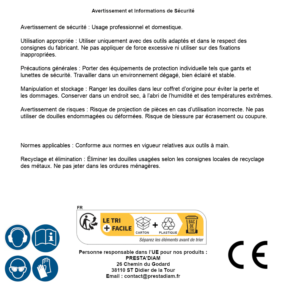 | AVERTISSEMENT et SECURITE | Identification de la personne responsable dans l’UE : Nom : PRESTA'DIAM. Adresse : 26 Chemin du Godard, 38110 ST Didier de la Tour (France). Email : contact@prestadiam.fr. |