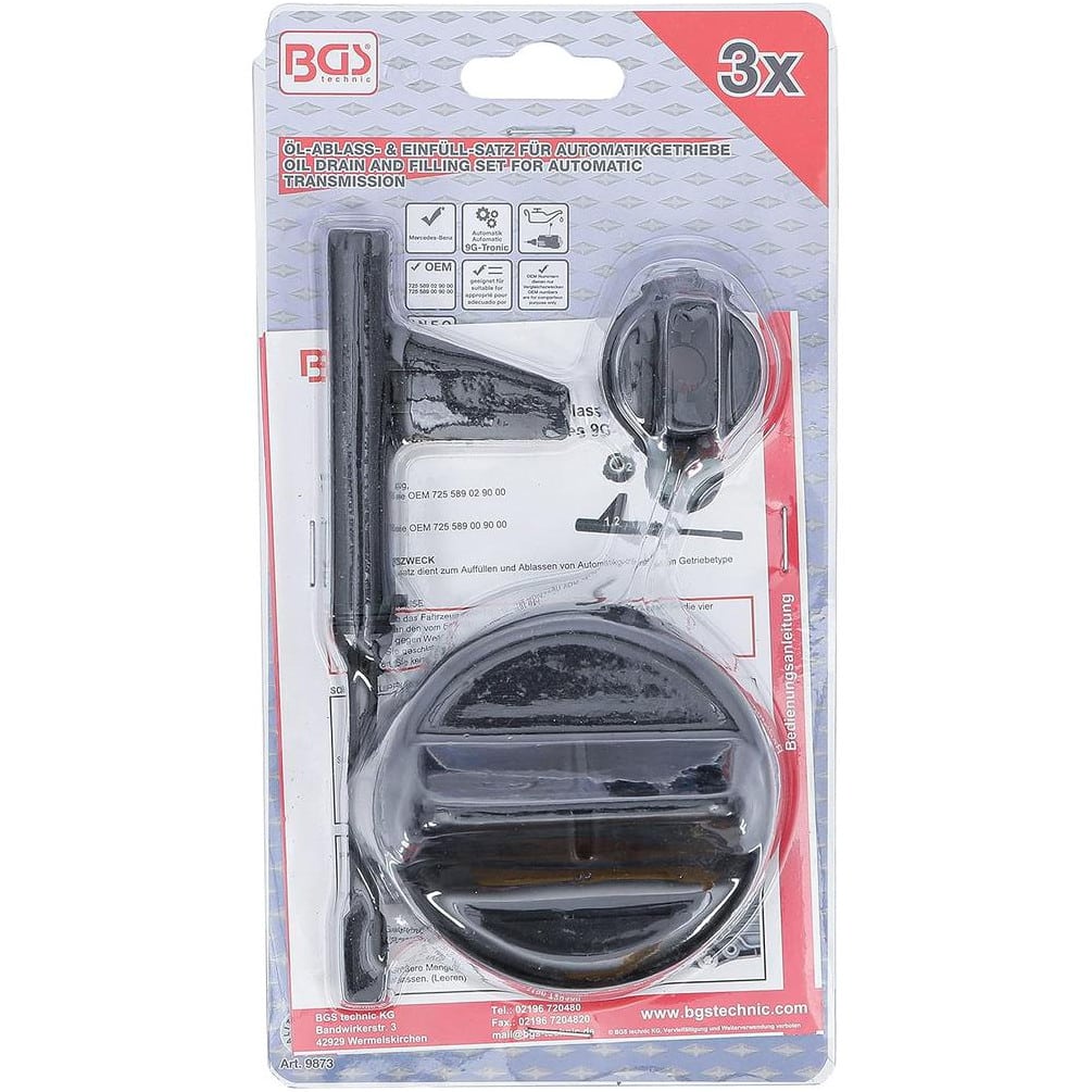 Le Kit de vidange et de remplissage d'huile pour transmissions automatiques Mercedes 9G-Tronic de la marque BGS est un outil spécialisé conçu pour faciliter l'entretien des boîtes de vitesses automatiques 9G-Tronic. Ce kit permet une vidange propre et un remplissage précis de l'huile de transmission, garantissant ainsi une performance optimale et une longévité accrue de la transmission.