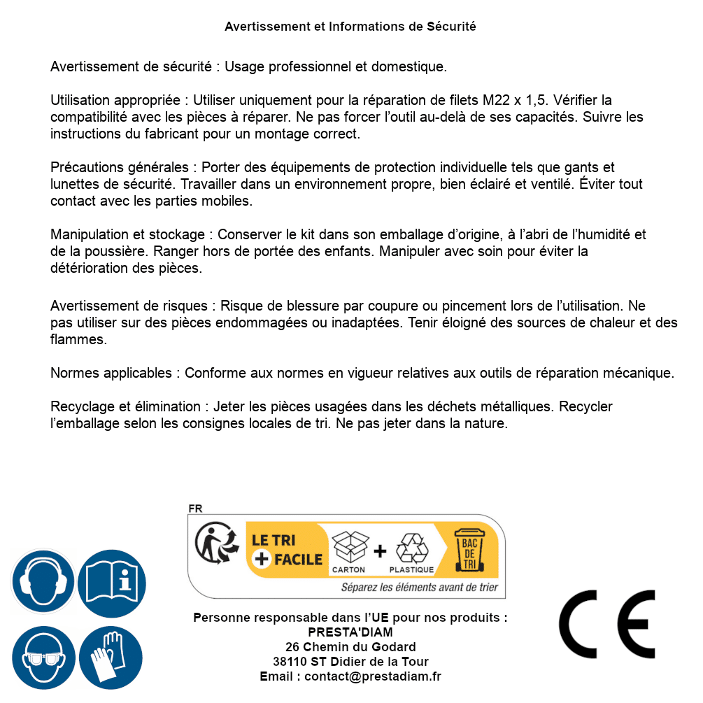 | AVERTISSEMENT et SECURITE | Identification de la personne responsable dans l’UE : Nom : PRESTA'DIAM. Adresse : 26 Chemin du Godard, 38110 ST Didier de la Tour (France). Email : contact@prestadiam.fr. |