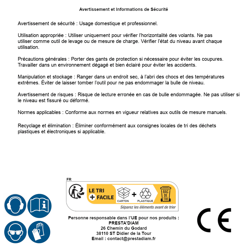 | AVERTISSEMENT et SECURITE | Identification de la personne responsable dans l’UE : Nom : PRESTA'DIAM. Adresse : 26 Chemin du Godard, 38110 ST Didier de la Tour (France). Email : contact@prestadiam.fr. |