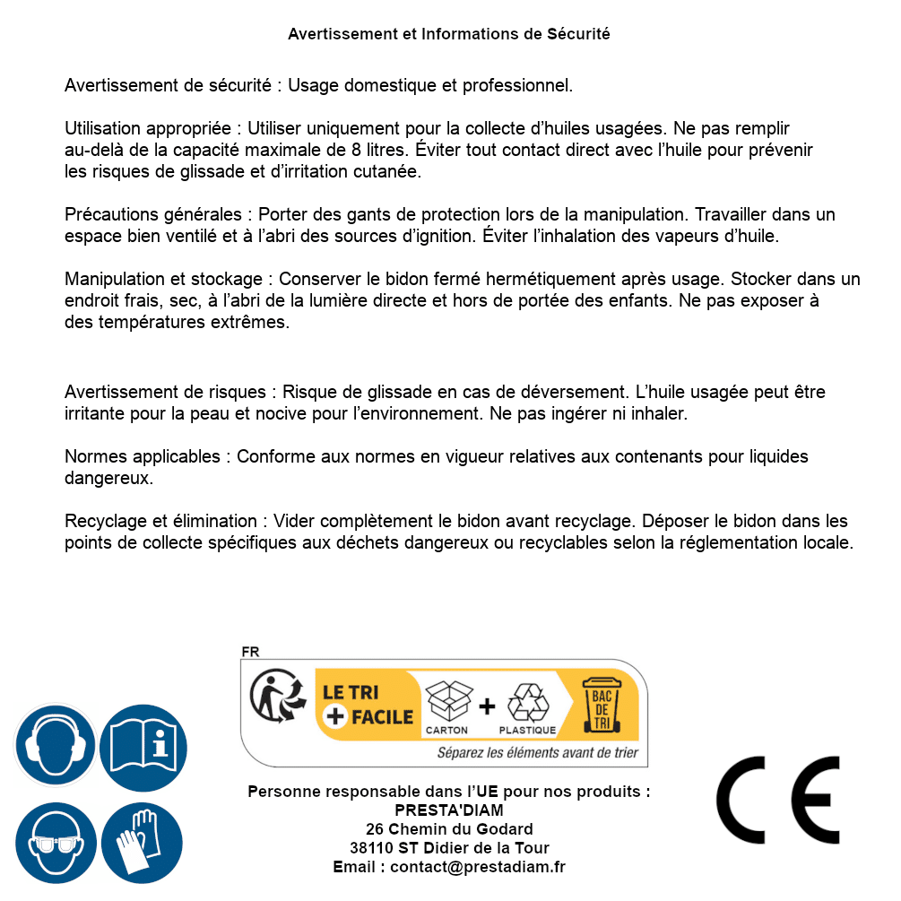 | AVERTISSEMENT et SECURITE | Identification de la personne responsable dans l’UE : Nom : PRESTA'DIAM. Adresse : 26 Chemin du Godard, 38110 ST Didier de la Tour (France). Email : contact@prestadiam.fr. |