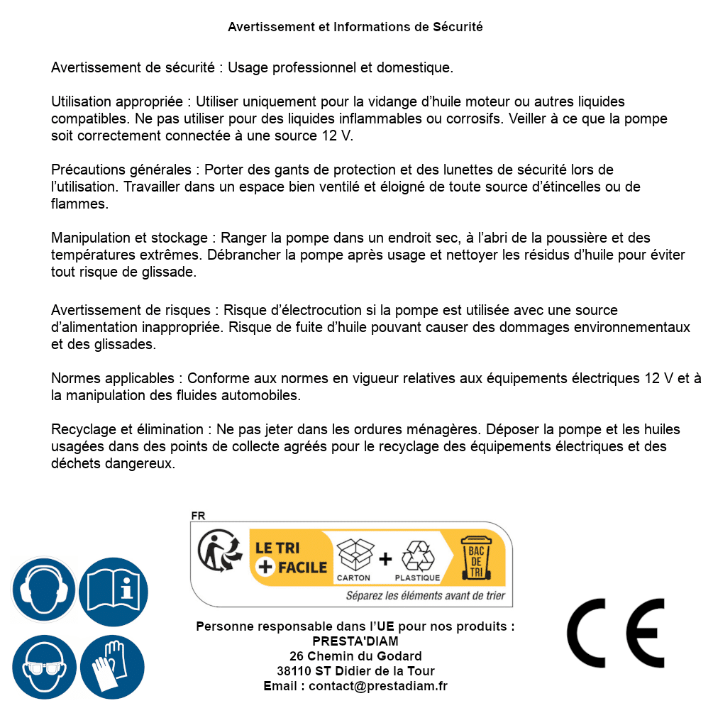 | AVERTISSEMENT et SECURITE | Identification de la personne responsable dans l’UE : Nom : PRESTA'DIAM. Adresse : 26 Chemin du Godard, 38110 ST Didier de la Tour (France). Email : contact@prestadiam.fr. |