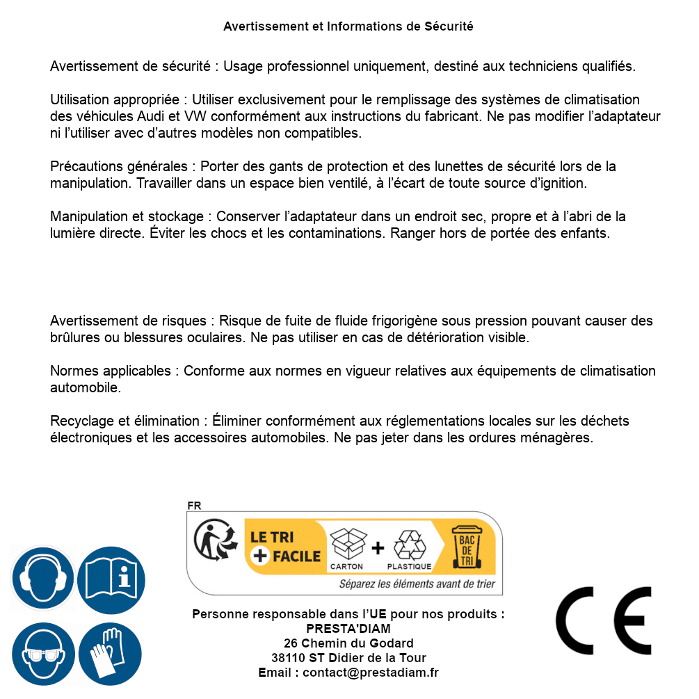| AVERTISSEMENT et SECURITE | Identification de la personne responsable dans l’UE : Nom : PRESTA'DIAM. Adresse : 26 Chemin du Godard, 38110 ST Didier de la Tour (France). Email : contact@prestadiam.fr. |