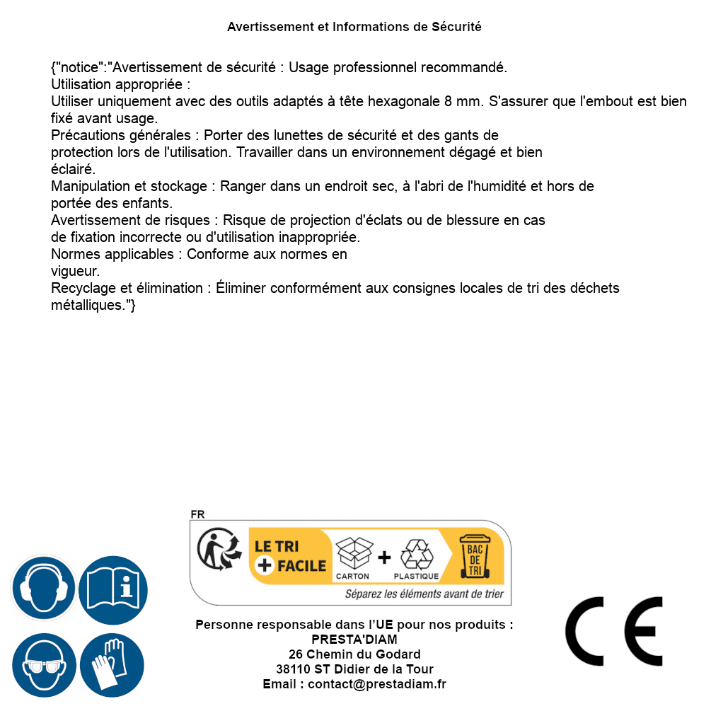 | AVERTISSEMENT et SECURITE | Identification de la personne responsable dans l’UE : Nom : PRESTA'DIAM. Adresse : 26 Chemin du Godard, 38110 ST Didier de la Tour (France). Email : contact@prestadiam.fr. |