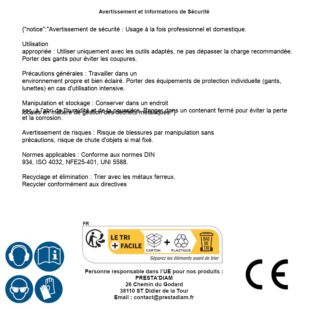 | AVERTISSEMENT et SECURITE | Identification de la personne responsable dans l’UE : Nom : PRESTA'DIAM. Adresse : 26 Chemin du Godard, 38110 ST Didier de la Tour (France). Email : contact@prestadiam.fr. |