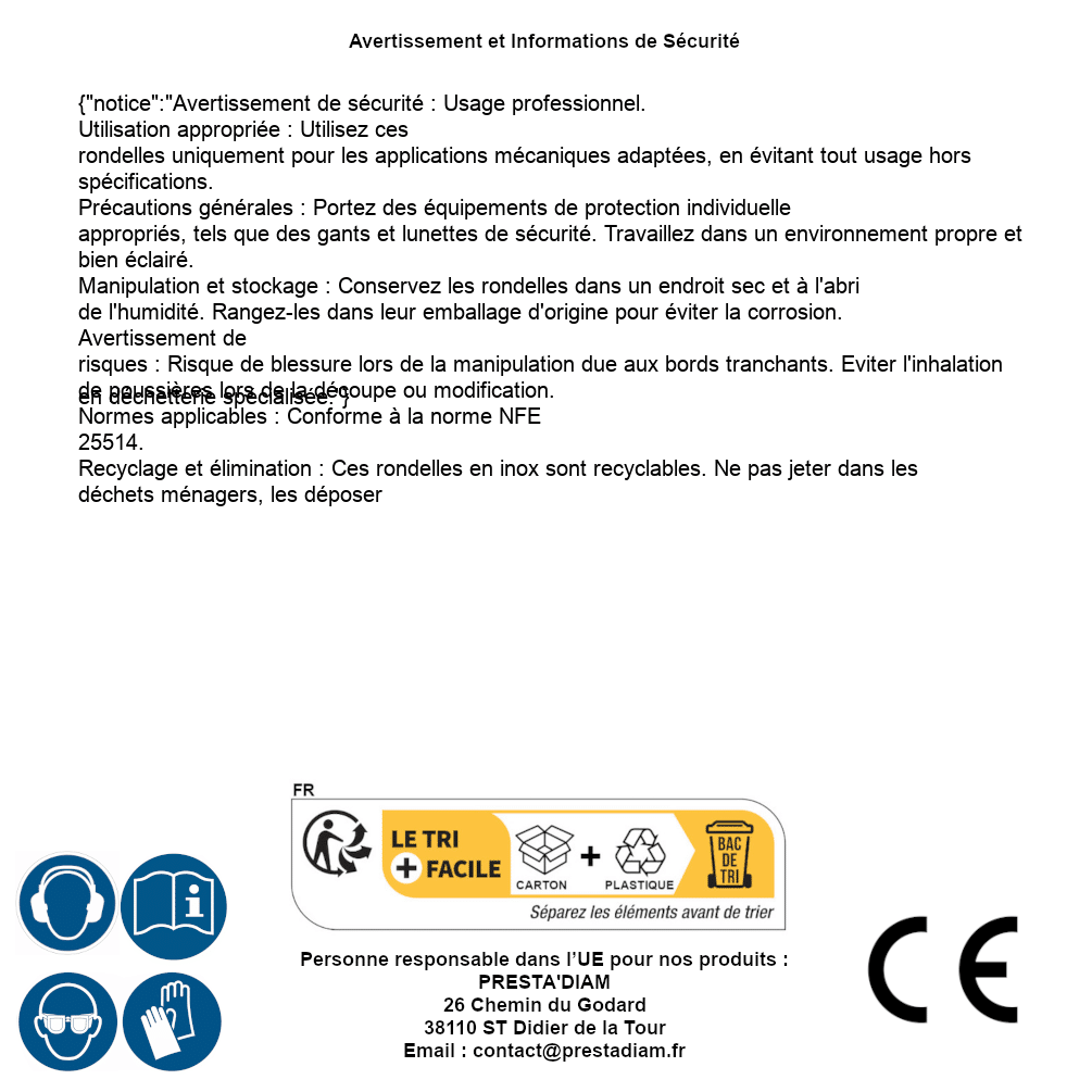 | AVERTISSEMENT et SECURITE | Identification de la personne responsable dans l’UE : Nom : PRESTA'DIAM. Adresse : 26 Chemin du Godard, 38110 ST Didier de la Tour (France). Email : contact@prestadiam.fr. |