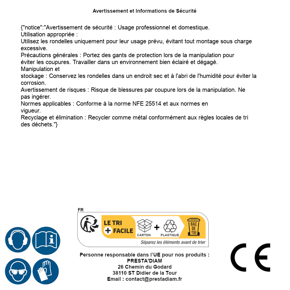 | AVERTISSEMENT et SECURITE | Identification de la personne responsable dans l’UE : Nom : PRESTA'DIAM. Adresse : 26 Chemin du Godard, 38110 ST Didier de la Tour (France). Email : contact@prestadiam.fr. |