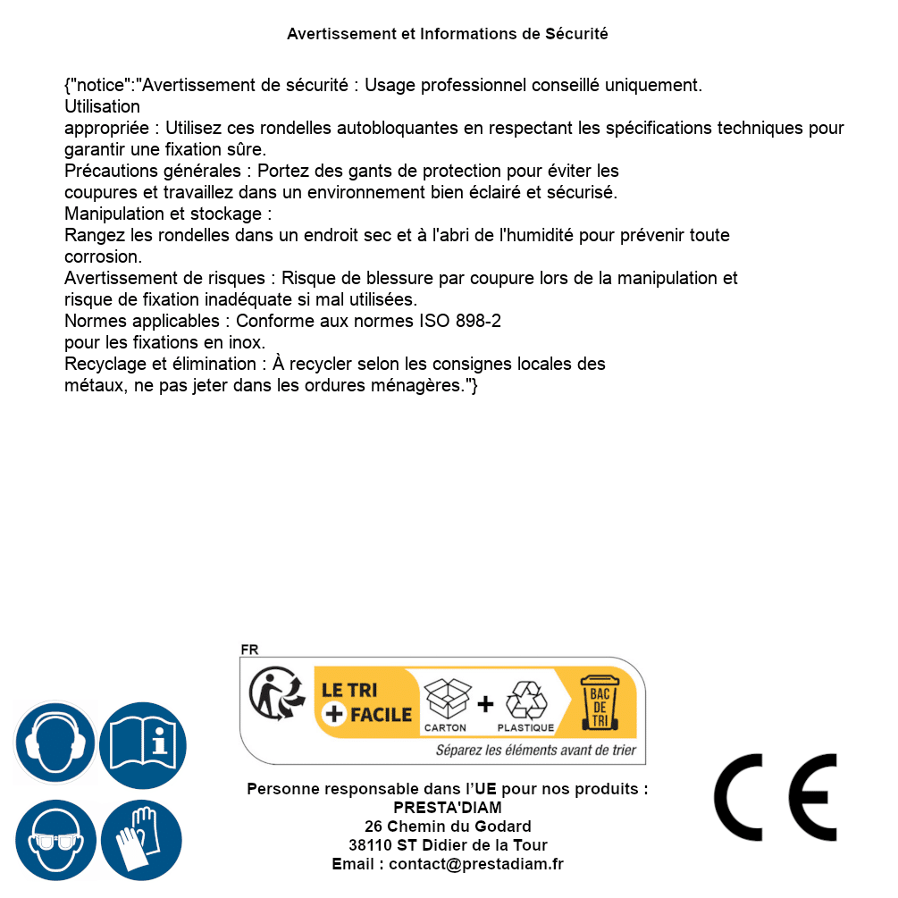 | AVERTISSEMENT et SECURITE | Identification de la personne responsable dans l’UE : Nom : PRESTA'DIAM. Adresse : 26 Chemin du Godard, 38110 ST Didier de la Tour (France). Email : contact@prestadiam.fr. |