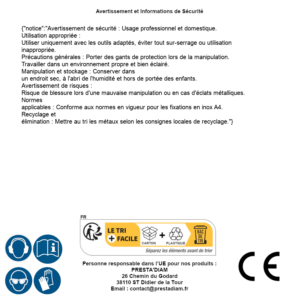 | AVERTISSEMENT et SECURITE | Identification de la personne responsable dans l’UE : Nom : PRESTA'DIAM. Adresse : 26 Chemin du Godard, 38110 ST Didier de la Tour (France). Email : contact@prestadiam.fr. |