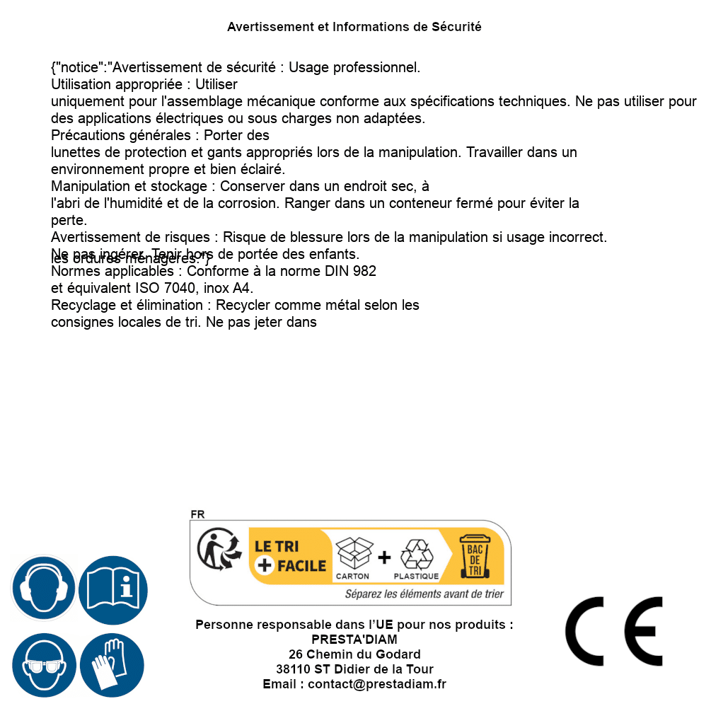 | AVERTISSEMENT et SECURITE | Identification de la personne responsable dans l’UE : Nom : PRESTA'DIAM. Adresse : 26 Chemin du Godard, 38110 ST Didier de la Tour (France). Email : contact@prestadiam.fr. |